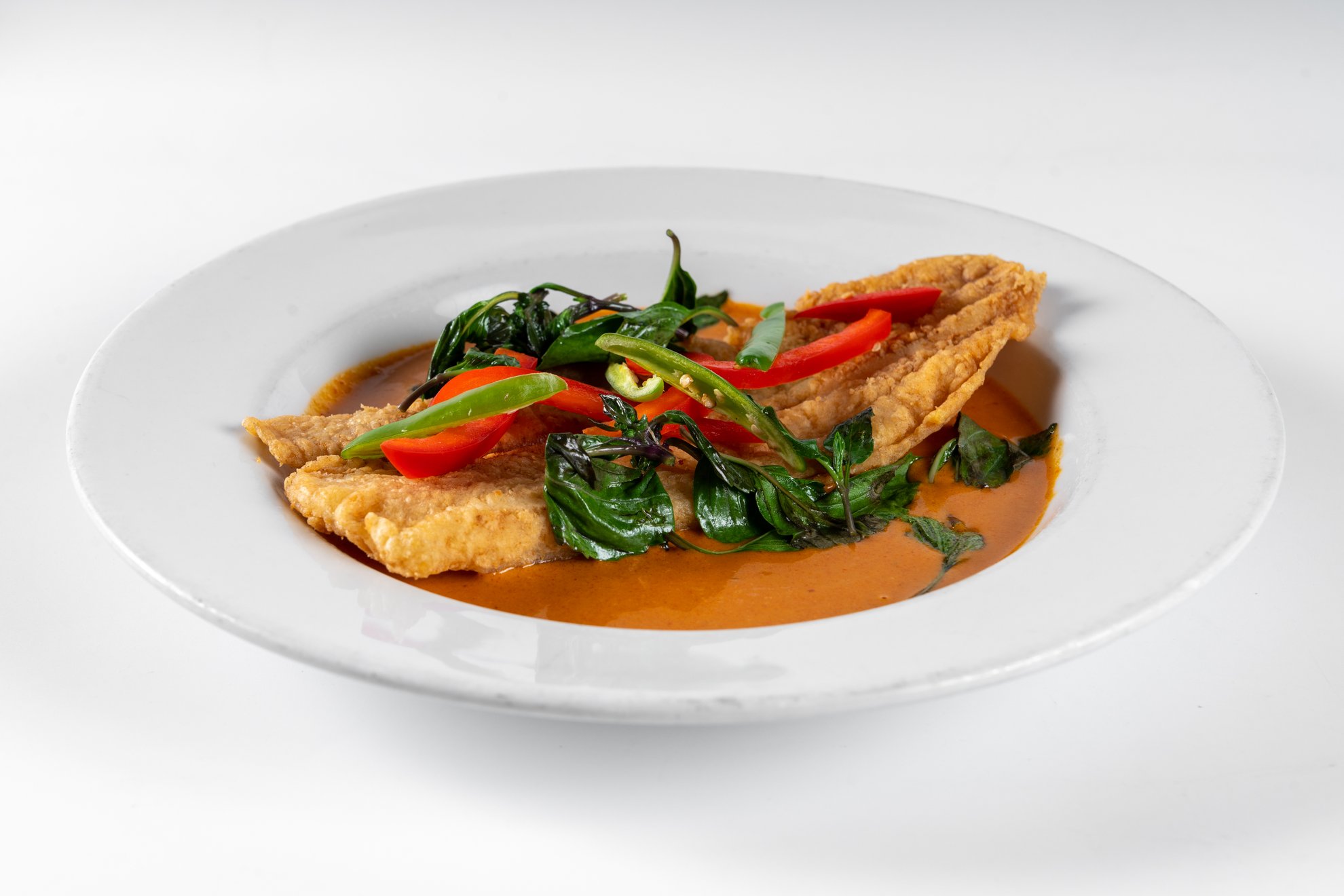 Spicy. Fillet of sole battered, deep-fried, & topped with red bell pepper & a zesty red curry sauce. Not served with side rice.